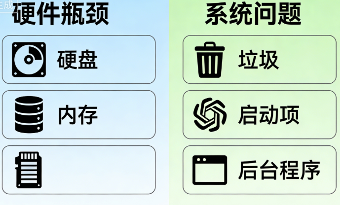 【图文提示】:插入一张“电脑卡顿常见原因示意图”,左侧列硬件瓶颈(硬盘、内存),右侧列系统问题(垃圾、启动项、后台程序),用简单图标区分,直观易懂。